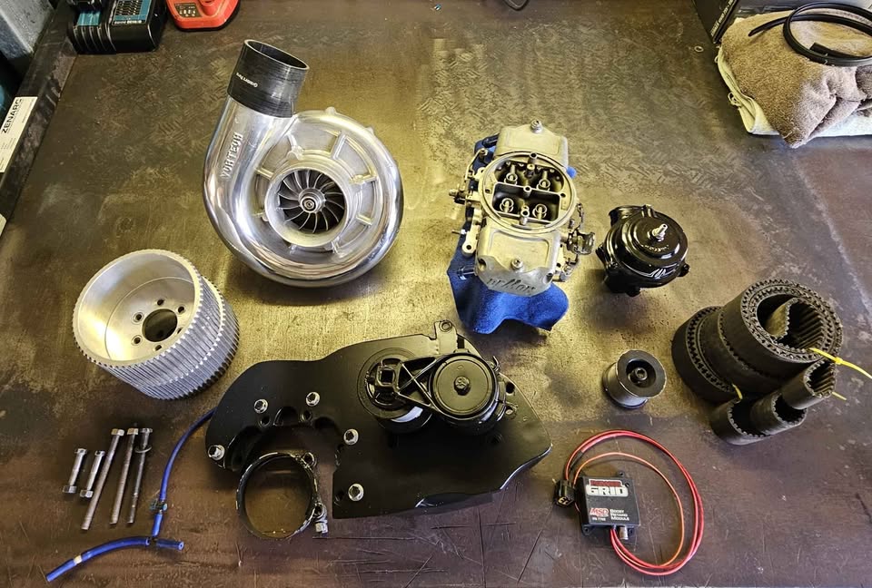 Polished Vortech V-4Z Race-H super charger with billet impeller, Alloy bracket to suit Small block chev that mounts blower top left hand side. Demon boost referance E85 carb, vortec blow off valve, msd boost retard module, 3x belts, 2x different size lower pulleys to change boost, bolts and clamps.